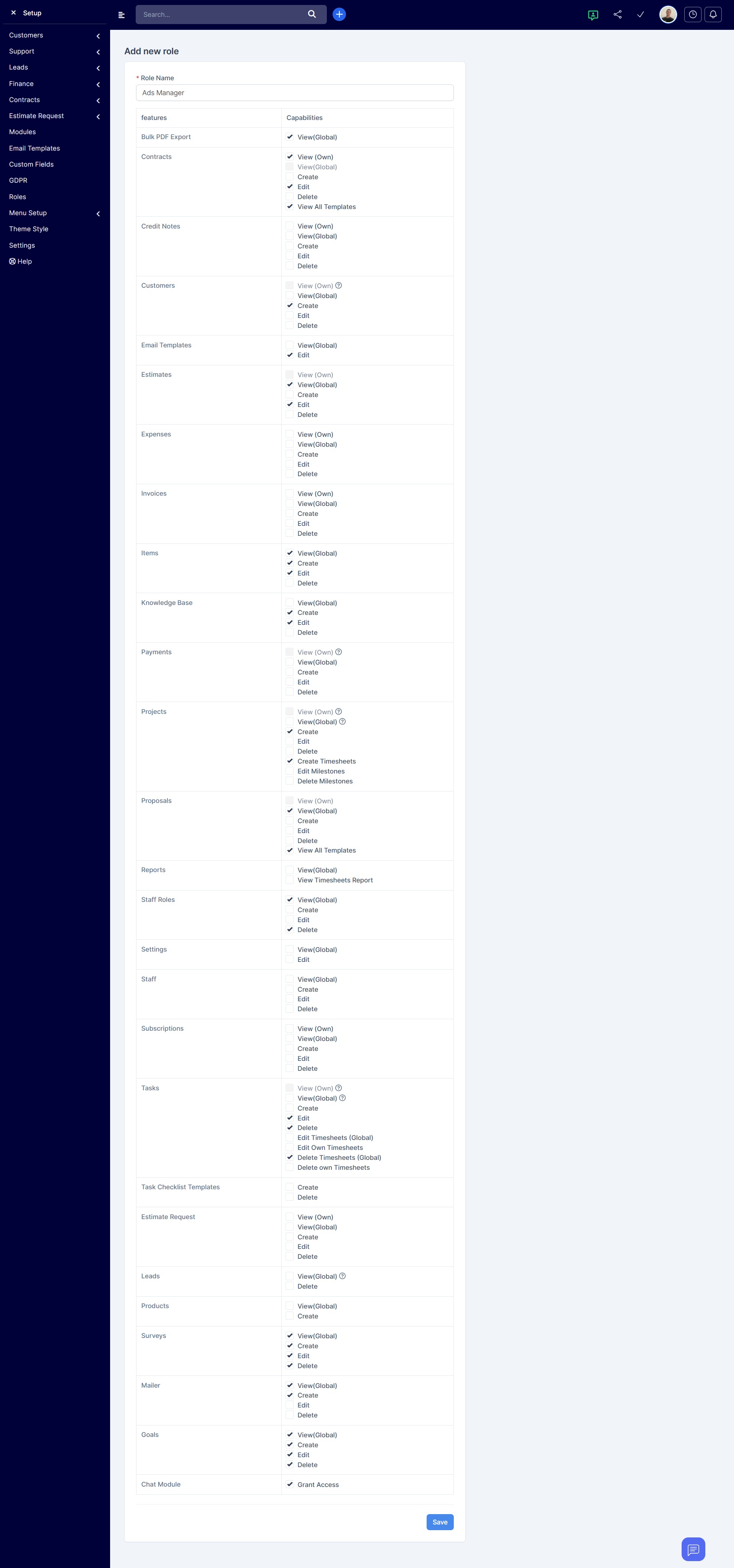 Customers — povolit zobrazení pouze vlastních zákazníků a vytváření nových.