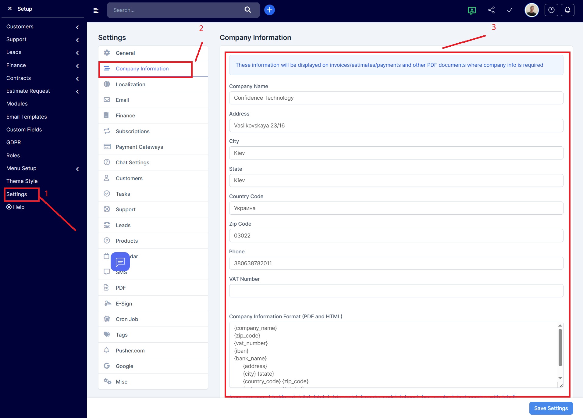 Setup → Settings → Company Information