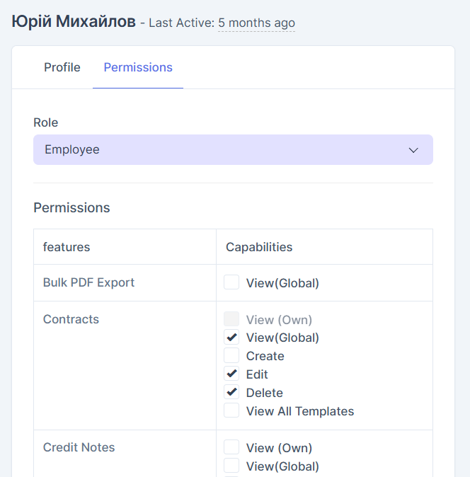Sekce Oprávnění (Permissions) umožňuje ručně spravovat přístup zaměstnance k jednotlivým modulům CRM.