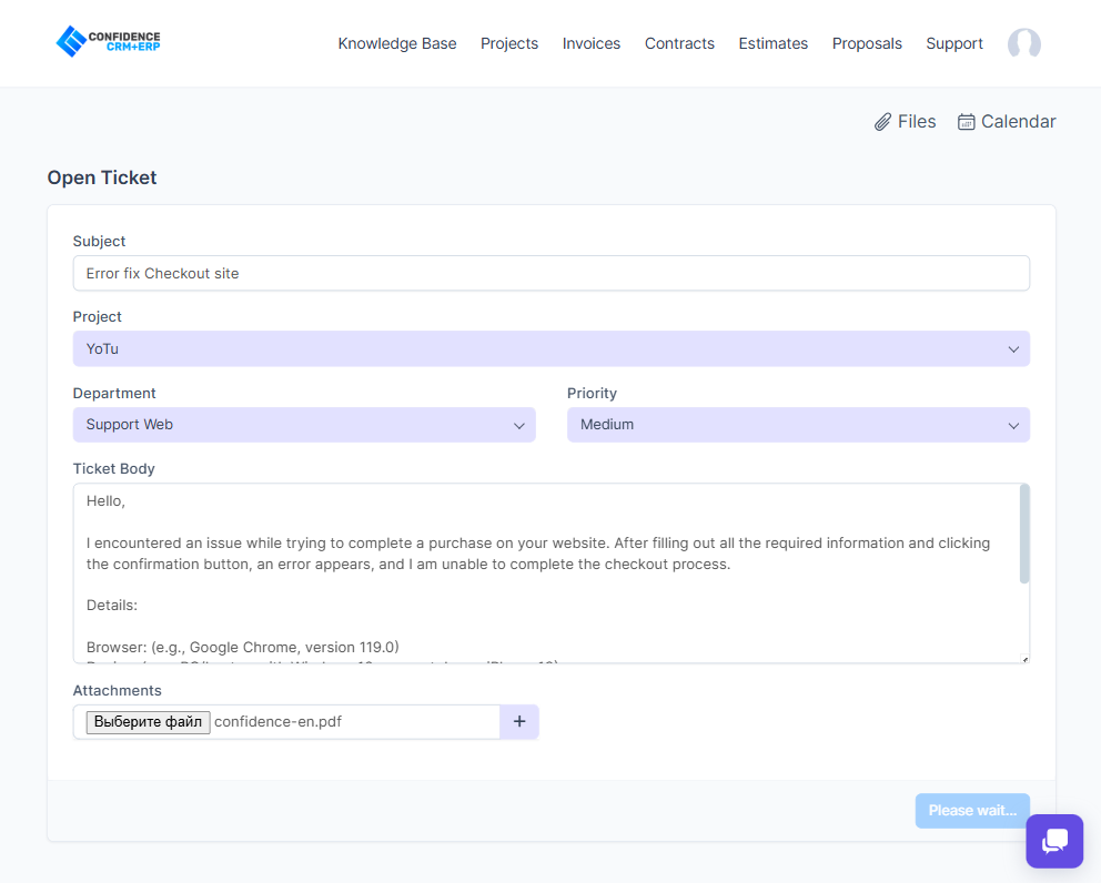 Customers can easily create tickets in their personal account to resolve issues or report problems. The interface offers a choice of categories, a description of the problem, and the ability to attach files. Once created, the ticket is automatically entered into the system for further processing by the administrator.